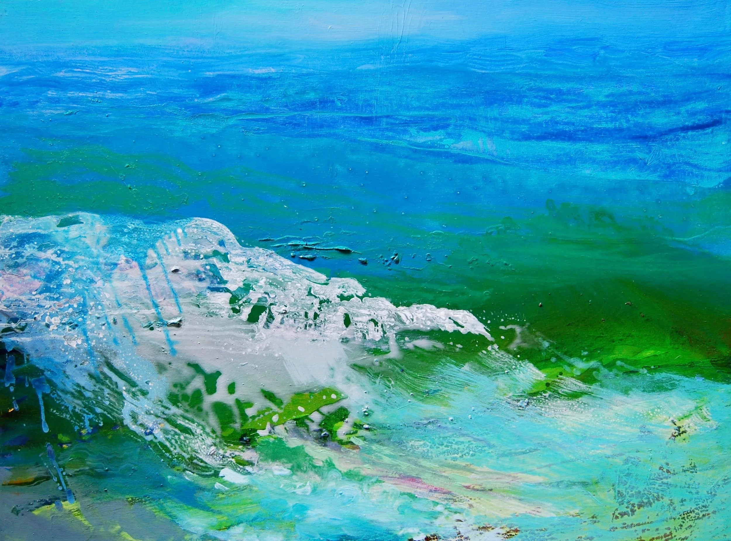 Being in nature ignites my senses. I am struck by the interaction of the order and the chaos. The endless combinations of lines, shapes and colors of the trees, vegetation and clouds are jumping off points. Pushing paint and colors around has been a passion since I was a very young girl. I pour, drip, pastel, splash and layer. I use big and small brushes but most often lately it is my fingers that move the paint. I challenge myself to invent marks that best define my reactions and passions. At seventeen a teacher at the Kansas City Art Institute introduced me to the power of color temperature. It is the core of my work and teaching.